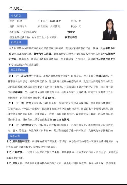 本人女,上高万象附近,省重点师范本科物理专业,研究生哈工深凝聚态物理,暑假有时间可辅导数学物理学科,性格开朗有责任心, 家教经验丰富, 欢迎加微信沟通交流15070539079